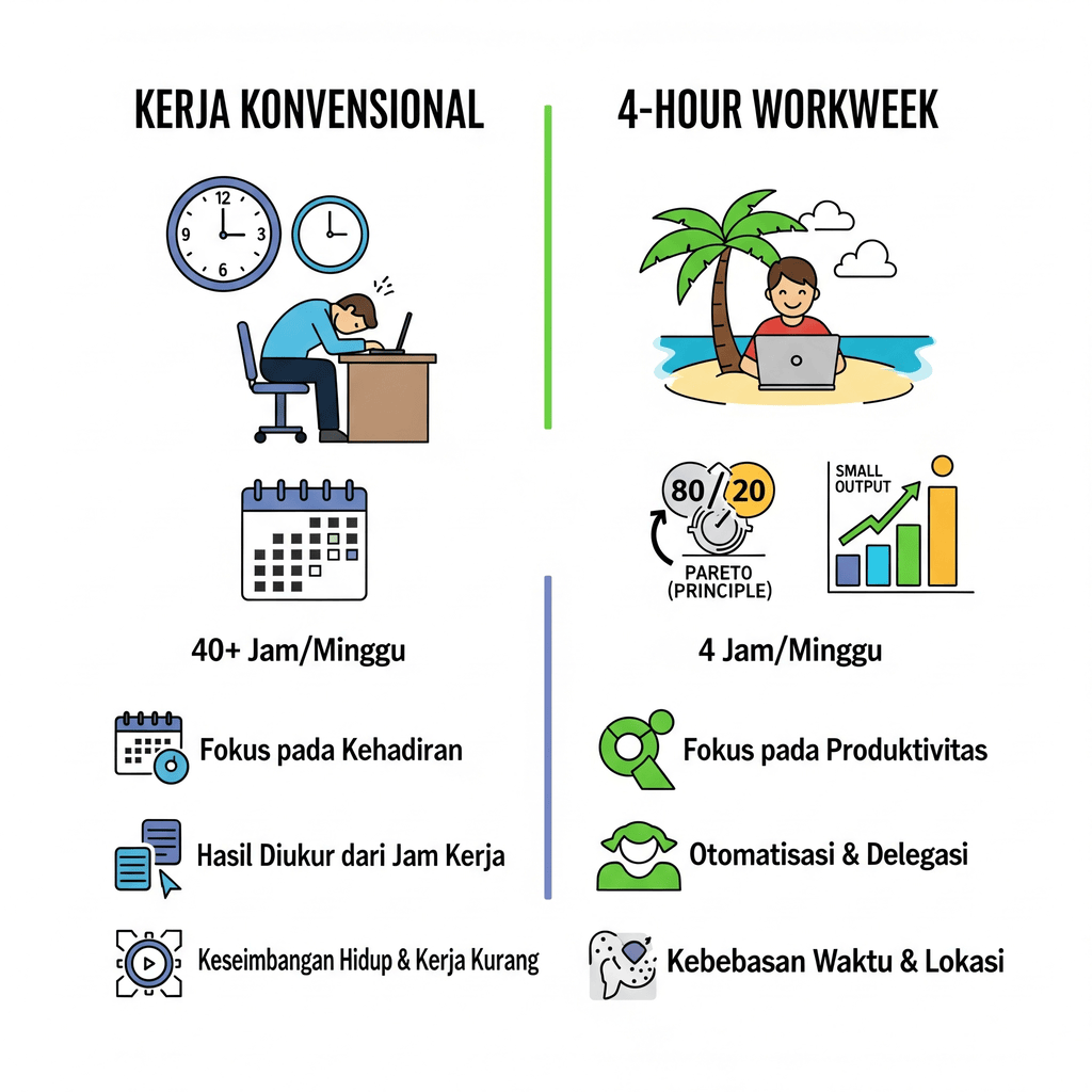 Salah satu revolusi terbesar dari buku ini adalah pemusnahan mentalitas “kerja keras = hasil besar”. Penulis membongkar mitos lama, menggantinya dengan satu pertanyaan kunci: “Bagaimana jika saya hanya bekerja 4 jam seminggu, apa yang akan saya lakukan berbeda?”